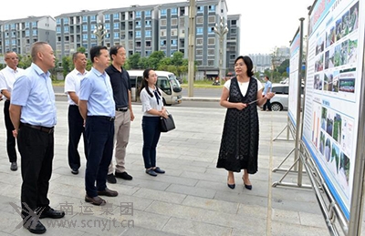 營(yíng)山縣副縣長(zhǎng)楊素梅(左一)在營(yíng)山汽車客運(yùn)站站前廣場(chǎng)的展板前,向?qū)巿?jiān)一行介紹營(yíng)山12328助力脫貧攻堅(jiān)工作開(kāi)展情況。