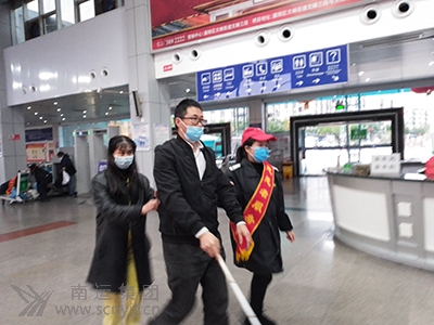 11月13日,寒風陣陣,天空下著小雨,明顯比前幾天冷了許多。八點十分左右,兩位旅客站立在南充汽車客運站售票廳門口,神態(tài)異常、焦急萬分,該站愛心班站務(wù)人員強燕和鄧雙發(fā)現(xiàn)后立即上前詢問,通過面對面觀察交流,得知兩位旅客都是盲人,他們乘坐出租車來到車站,準備坐9;30前往隆昌的班車。由于出租車司機把他們送到站前廣場就離開了,一時之間,他們不知道該往哪里去。身邊又無人陪同,強燕和鄧雙了解情況后,立即開展幫扶行動,一個攙扶兩位盲人旅客,一個用愛心推車將他們的行李搬到推車上,通過安檢直接推送到候車室暫時休息。 九點十分,兩位站務(wù)人員提前通過綠色通道,將兩位盲人旅客送進站臺攙扶上車,裝好行李。并告訴駕駛員這兩位旅客的情況,再三叮囑一定要把這兩位盲人旅客送到接站的家人手里。 愛心班站務(wù)人員細心周到的服務(wù),讓這兩位盲人旅客感激不已,坐上車后,他們緊握著愛心班工作人員的手說道:“謝謝,謝謝你們了!”“不用謝,這是我們應(yīng)該做的。”強燕和鄧雙異口同聲的回答道。目送著班車的發(fā)出,她們又立即返回到自己的工作崗位上,準備為下一位旅客服務(wù)。 真誠做人、平凡善舉、用心做事,踐行服務(wù)至上的理念,用愛溫暖旅客回家路,是該站愛心班每位成員的優(yōu)良傳統(tǒng)。 (李利 陳春華)