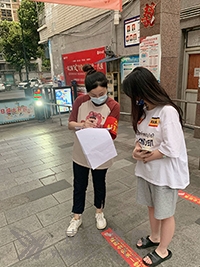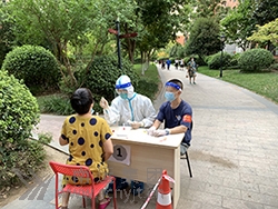旅游分公司黨員張菁(右一)參加社區(qū)抗疫維護(hù)秩序。