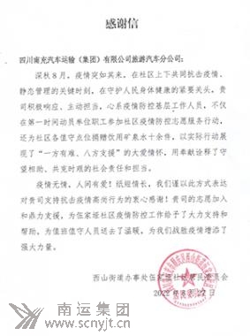 鄧迪還自費(fèi)為社區(qū)各值守點(diǎn)位捐贈(zèng)飲用礦泉水十余件,極大的彰顯了南運(yùn)集團(tuán)共產(chǎn)黨員在關(guān)鍵時(shí)刻、危難時(shí)刻奉獻(xiàn)社會(huì)的先鋒模范作用,社區(qū)大媽們翹起大拇指說(shuō):“你們南運(yùn)人真棒!”8月27日,順慶區(qū)西山街道辦事處伍家埡社區(qū)居民委員會(huì)還給南運(yùn)集團(tuán)旅游分公司寄來(lái)了情真意切的《感謝信》。
