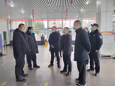 市委常委、市政法委書記陳有波(左三)在南充汽車客運站檢查春運治安維穩工作。