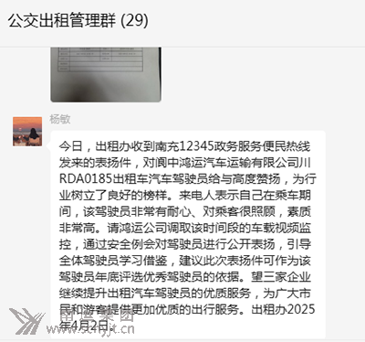 4月2日,南充市12345政務服務便民熱線向閬中市出租辦發送了一封《表揚信》,信中對南運集團閬中鴻運汽車運輸有限公司的一位司機——川RDA0185鴻運出租車駕駛員陳星吉表示了高度贊揚。 《表揚信》中提到,乘客在乘坐的哥陳星吉駕駛的出租車時,深切體會到了他極佳的耐心以及對乘客的細致照顧。即便面對飲酒的乘客,陳星吉也表現出了極大的寬容和關懷,確保了乘客的安全和舒適。他的專業能力和優質服務無疑對出租車行業產生了正面的影響。因此,《表揚信》的發送者希望通過熱線中心向陳星吉表達深深的感激和贊揚,以表彰他出色的服務態度和對乘客的關懷。 多年來,閬中鴻運汽車運輸有限公司的“的哥”、“的姐“們,為乘客服務的好人好事層出不窮,他們始終堅守南運集團“奉獻社會是神圣使命”的經營理念以及出租公司“乘客大于我”的服務理念,將乘客的舒適與安全視為重中之重,致力于為每一位乘客提供最優質、最貼心的出行服務。 此次“的哥”陳星吉受到點贊,不僅是對他個人職業精神的肯定,更是對閬中鴻運公司整體服務水平的認可。鴻運公司對此深感自豪,并將以此為契機,進一步提升服務質量,加強員工培訓,確保每一位司機都能像陳星吉一樣,以高度的責任心和專業的服務技能,為乘客提供安全、舒適、溫馨的出行體驗。同時,鴻運公司也將加大對優秀出租車駕駛員的表彰和獎勵力度,激勵全體從業人員向榜樣學習,共同推動出租車行業的健康發展。 (閬中分公司 劉玉)