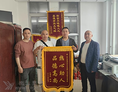患者乘客張國民(左二)給營山鴻運的哥肖建俠(右二)贈送大紅錦旗以表謝意。