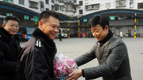 2月5日,市交通運輸局副局長蒲五才深入城北汽車客運站慰問一線員工,并要求車站要重視從事春運工作人員的身體健康,針對今年春運客流及運輸生產情況,做好各項安全生產管理工作和各項服務工作,不讓旅客滯留在車站,確保春運平安祥和。圖為市交通運輸局副局長蒲五才(右)一行來到城北汽車客運站,看望慰問奮斗在春運一線的車站員工。