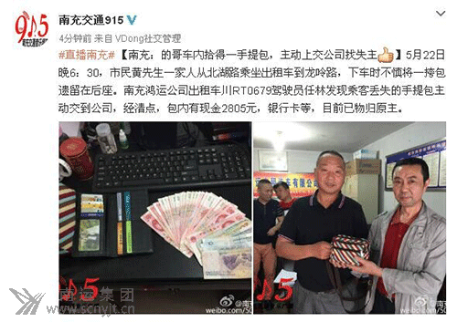5月22日晚6:30,市民黃先生一家從北湖路乘坐出租車到龍吟路,下車時不慎將一挎包遺留在后座。南充鴻運出租汽車川RT0679駕駛員任林發現后,主動將乘客遺失的挎包交到公司,經公司管理人員當面清點,包內有現金2805.00元,已及銀行卡等。經多方聯系后,乘客遺失財物已物歸原主。