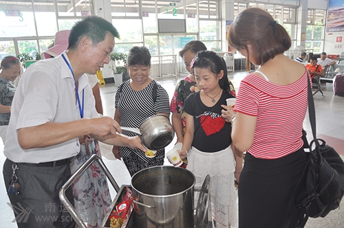入夏以來,氣溫不斷升高,熱浪滾滾襲來,為保障奮戰在生產一線員工的工作安全與身心健康,為廣大旅客和駕乘人員做好服務,南充汽車客運站認真搞好防暑降溫工作,在高溫時段堅持每天熬制綠豆南瓜湯,為旅客、站務人員和駕乘人員送清涼。 車站購買綠豆50斤、南瓜50斤、冰糖20斤等食品,每一個高溫日,組織行政工作人員和“匡紅艷愛心班”人員將熬制好的綠豆南瓜湯送到旅客和一線員工、廣大駕乘人員手中,受到了大家的一致好評。 一位來自內江的旅客說到:“沒想到你們車站還給旅客送綠豆湯解暑,我在其它地方還沒有碰到過。”工作人員一邊送綠豆湯一邊答道:“高溫季節,我們天天都要給大家送,歡迎你再來品嘗。”旅客由衷的贊嘆道:“你們的服務真好,謝謝!”