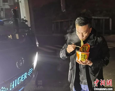 中新網南充1月22日電 (王爵 楊波)21日,是農歷大年三十;楊洪,今年46歲,是廣東至四川南充線一名長途客運司機,是他安全完成春運任務的16個年頭,21日19時20分左右,楊洪順利到達重慶武隆服務區后,抓緊吃了碗泡面,外加了兩個鹵雞蛋,這就是楊洪今年的年夜飯。 據了解,楊洪每年的年夜飯都是泡面加兩個鹵蛋,今年他也不例外。楊洪說,按照現在的速度,估計22日凌晨1點前就可以把旅客安全送達南充,盡量讓旅客安全準時能回家過年。
